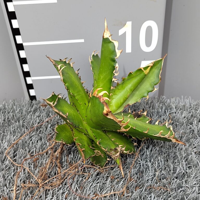 Agave titanota (oteroi) Red Catweasle forms a bold and dense rosette of fleshy green-glaucous leaves with bold spint margins in shades of pale beige-cream. Usually forming a single rosette and and more compact variety, this is an excellent contender for container growing. Plant in very free draining soil and place in a sunny warm position. Protect from freezing and soggy conditions over the winter months. Rare and beautiful!