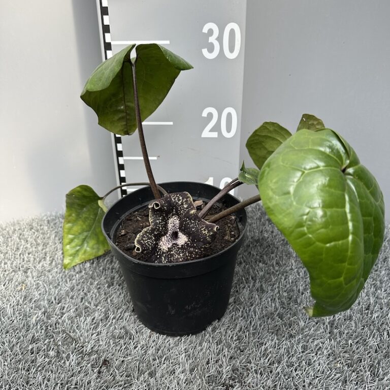Asarum nobilissimum ‘Deep Throat’ is an outrageous evergreen species and surely will provide a real ‘talking point’ in the garden! The glossy, heart-shaped and deep green foliage can reach up to 25-30cm in length but the mysterious flowers are something else! Sitiated at the base of the plant the flowers can reach up to 10cm across and are deep-pruple, al ost black with creamy yellow flecks. The ‘eye’ or ‘throat’ of the flower is deep-purple-pink. Quite extraordinary and remarkably fully hardy. Plant in fertile, moisture retentive soil in partial to full shade and try not to snigger too much at the name.