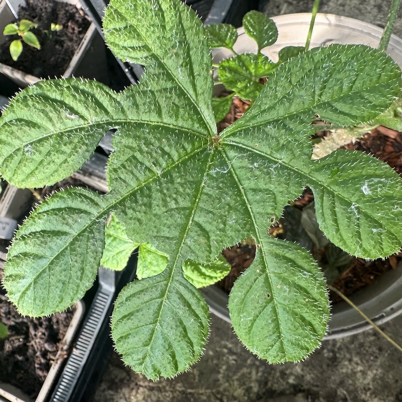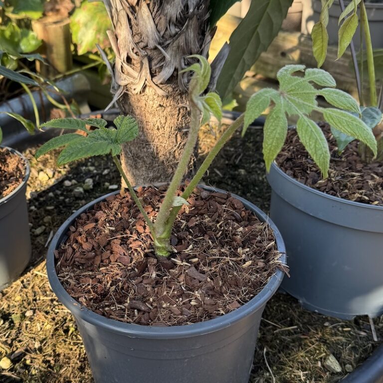 Brassaiopsis mitis is a truly remarkable deciduous shrub-like plant originating from mountain sides in north east Asia where it grows in dappled sunlight along woodland edges. It produces incredible palmate leaves with long fingers when young which can be over 50cm in diameter, hard to describe but once seen never forgotten. It can reach 3-4m in height the adult leaves being even larger, more palmate and equally stunning. Best planted in a shelterted position away from strong winds which can damage the magnificent leaves, in fertile, free draining soil.