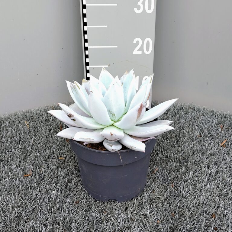 Echeveria ‘Mexican Giant’ is a bold and fabulous succulent with ghostly silver-pale blue-white cloudy foliage which has a waxy bloom. The chunky leaves are lance-shaped and arranged in a dense rosette the tips are pointed and tinged with deep red. Echeveria ‘Mexican Giant’ will reach around 30-40cm across.You may place outside during the summer months if desired. Otherwise this beautiful succulent is an excellent addition to a sunny windowsill, bright room or conservatory.