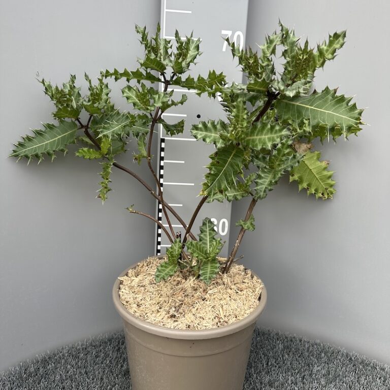Acanthus sennii is another wonderul and bold form from Ethiopia. Beautiful spiny deep green leaves with white veining and if grown in a mild and sheltered spot, spectacular red-orasnge flowers may appear during later summer into autumn. Plant in free draining fetil soil in a sun to partially shaded position or may be container grown to great effect.