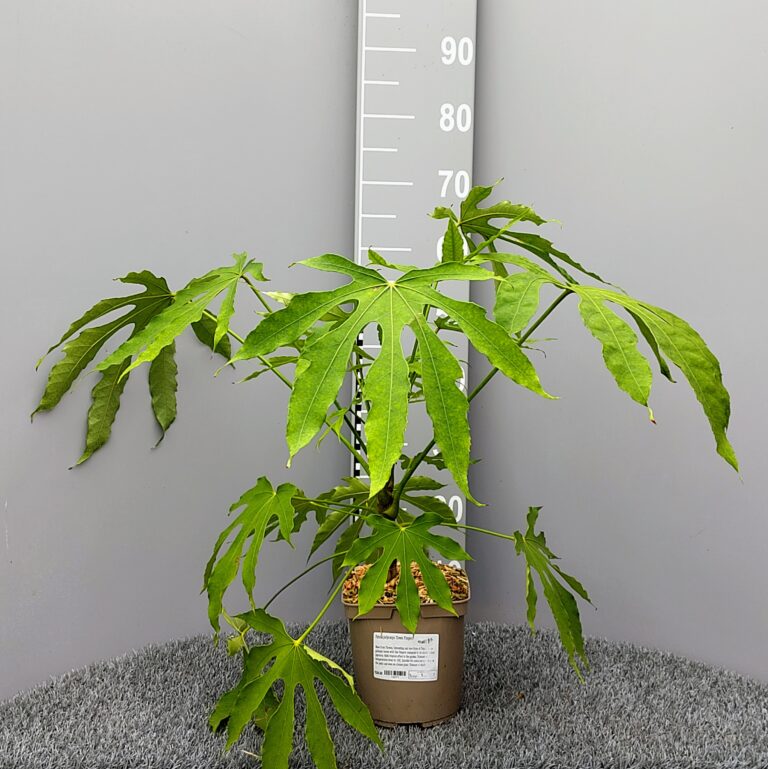 Should be hardy in most gardens but maybe worth giving a little shelter if you live in a particularly cold spot. Like most fatsia ‘Green Fingers’ is an adaptable plant, happy in a cool convervatory or even as a houseplant. We grow ours in rich fertile moisture retentive but not waterlogged soil located in dappled shade where it can reach 2 or more metres high albeit quiet slowly. All in all a rather aristrocratic choice jungly looking plant which interestingly have the typical ivy like flowers produced in early autumn providing late season nectar to butterflies and bees.