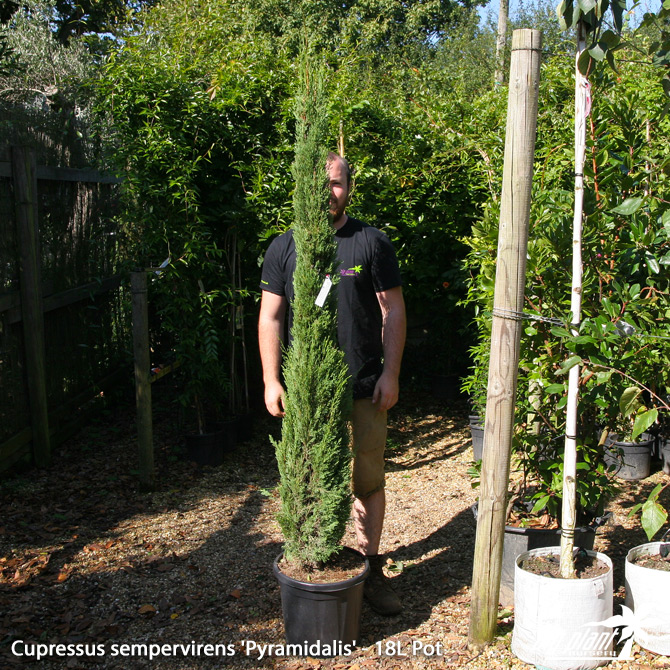 Cupressus sempervirens ‘Pyramidalis’, the Italian Cypress is a narrow almost pencil-like coniferous tree with dark green foliage and prickly brown cones. Very architectural. It is tolerant of poor soils and grows to its full potential in a sunny spot. It will grow quite happily in a container as long as it has regular watering. Clip regularly to maintain a compact, neat appearance. Water well before planting and regularly until established. We recommend using a mycrorrhizal fungi when planting for a healthier and more dense root system. Eventual Size: Up to 4 metres, but can be pruned.