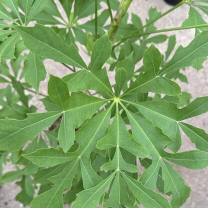 Cussonia spicata is a magnificent member of the Araliaceae family and a South African native known as ‘The Spike Cabbage Tree’. The foliage ia an extraordinnary shape – almost like snowflakes in deep green. Stems are pale green with wonderful patterns. Maybe grown outside year round in mild sheltered gardens and grown in containers and moved in otherwise. Plant in fertile free draining soil. Limited numbers currently available however we’re expecting more stock in Spring.