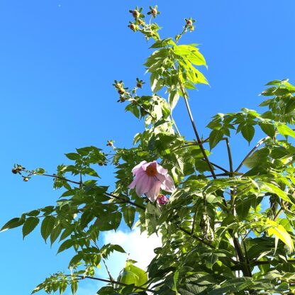 Dahlia imperialis ‘Gun Metal’ is a fabulous purple grey stemmed form of the huge large leafed jungly ‘Tree Dahlia’, with enormous leaves and thick purple grey sturdy trunks ‘Gun Metal’ is an impressive addition to the garden. Originally from Mexico where it can reach heights of 5 metres tall the very tops of each stem supporting dainty pinkish white to white simple flowers which attractively hang in clusters. The main stems are so thick and being typical of all dahlias are hollow making great natural containers which local people in the past often used to store and carry water amongst other things.