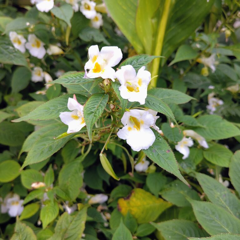 Impatiens arguta ‘Alba’ is a beautiful variety suited to woodland-style habitat in a semi-shade position. Reaching between 45-60cm, foliage and stems emerge in spring in bold green. Pretty white trumpet/bell-like flowers emerge in late spring-summer wich hang elegantly. Plant in free draining moisture retenetive fertile soil and apply a mulch over the winter months while the plant is in dormancy.