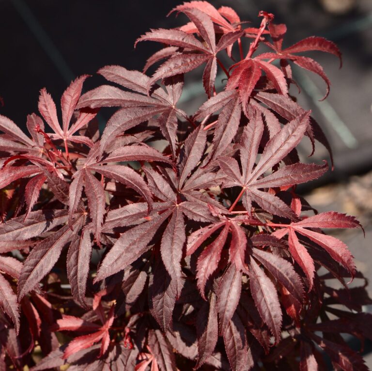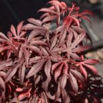 Acer palmatum ‘Shaina’ is one of my favourite japanese maples. ‘Shaina’ has dark purply red leaves which are topped through the growing season by bright pink-red new growth. It was first discovered growing as a witches broom and as such is a very compact grower. In autumn it turns shades of red, maroon and pink. Quite slow growing ‘Shaina’ makes a lovely small specimen either planted or in a container. Position in appled sun / part shade, out of cold drying winds – especially coastal winds. Suitable for all soils, but avoid waterlogged areas very dry soils will need extra watering.