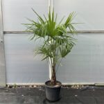 Trachycarpus, being a single trunk palm can become quite tall, eight to fifteen metres or so after many many years. As a guide here at the nursery garden, after ten years, we have palms ranging from 2m trunks up to some approaching 3.5M. I’ve found that young palms tend to grow rapidly up to 2-3m then slow down reducing altitude and concentrating on flowering and reproduction, slowly gaining height as new leaves are produced each year.